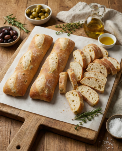 Багет чіабата з оливками поєднує італійську пористу текстуру чіабати з середземноморським смаком олив — ідеальний варіант для закусок та брускетт.