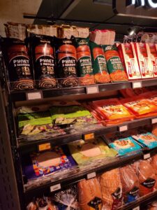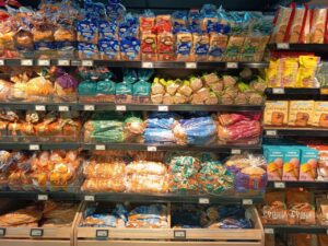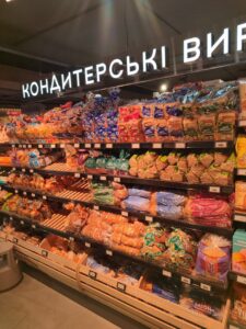 Серед усієї цієї краси та символізму на полицях стоїть те, що справді живить людей — хліб. І тут “Цар Хліб” представлений максимально широко. З чотирьох виробників хлібобулочної продукції у магазині (Київхліб, Рум’янець, Височанка та Цар Хліб), продукція “Хлібних інвестицій” зайняла рівно половину — цілий стелаж з 19 позиціями.